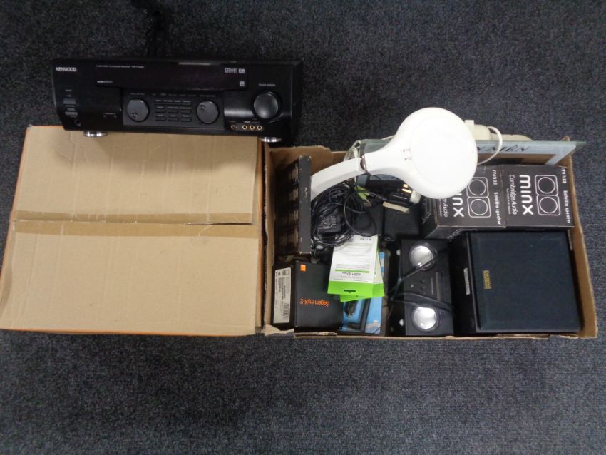 A Kenwood KRF-V7030D Audio Video surround receiver together with a further box containing miscellaneous electricals to include mobile phone, angle-poise lamp, Cambridge Audio sub and satellite speakers