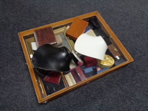 A counter top display cabinet containing a large quantity of assorted jewellery boxes, ring display stands, necklace stands