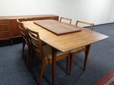 A mid 20th century McIntosh Furniture six piece dining room suite comprising low sideboard, extending table and four chairs
