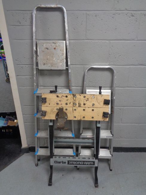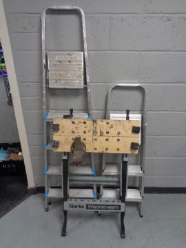Two sets of folding aluminium steps together with a folding Clarke Strong-arm folding workbench