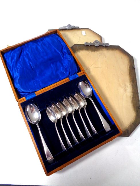 Two Edwardian octagonal picture frames together with a set of cased dessert spoons