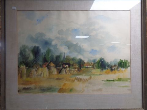 A 20th century watercolour, Field with village beyond, signed Phillips.