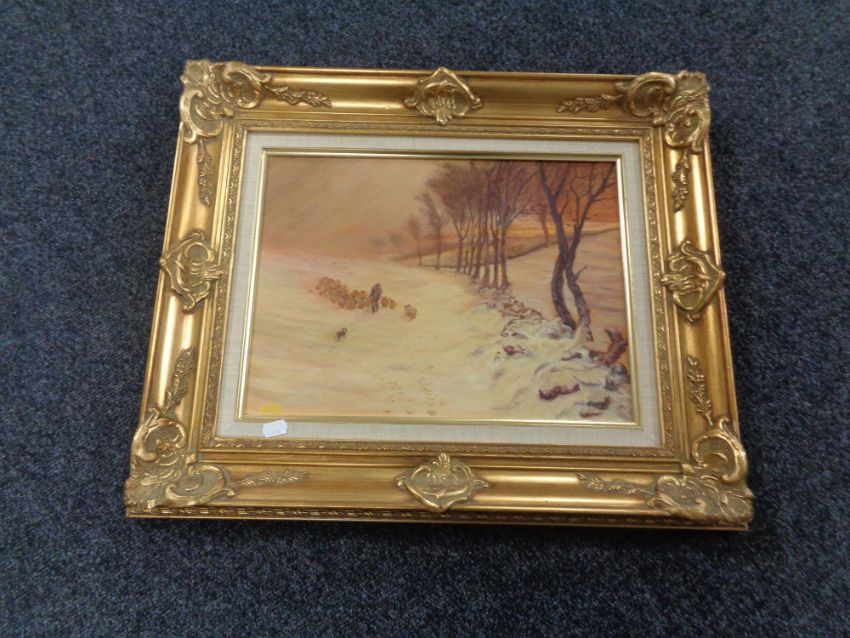An oil on board, shepherd herding sheep in a winter landscape, in gilt frame