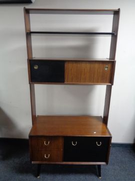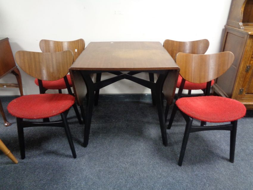 A six piece mid 20th century G-Plan teak dining room suite comprising of room divider, drop leaf table and four chairs
