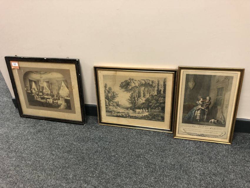 A French hand coloured antique print depicting a courting couple, 26 x 36 cm, together with two further monochrome prints (3)