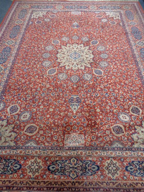 A machine made fringed woolen Persian design carpet on red ground, 375cm by 274cm