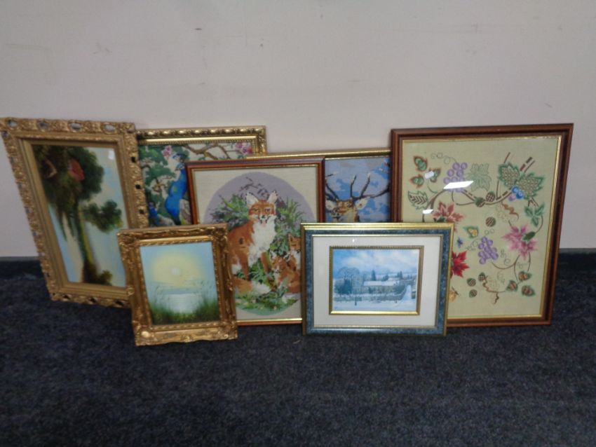 A box containing a framed needlework panel together with three further woolwork panels, oil on canvas, seagulls in flight, etc