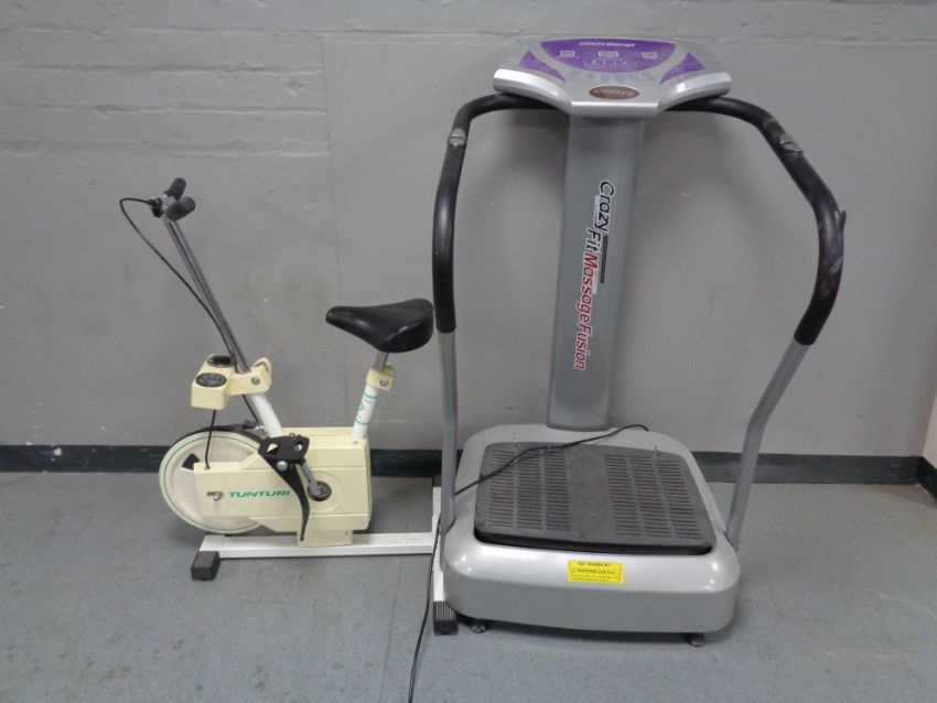 A Crazy Fit vibrating massage plate together with a Tunturi exercise bike