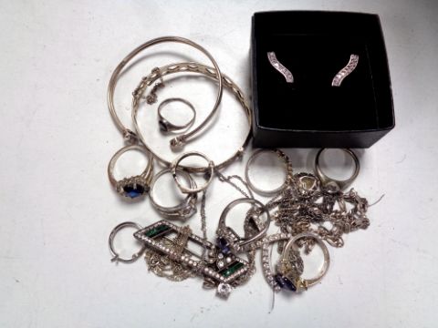 A collection of silver jewellery : brooches, rings, bangles, earrings, etc