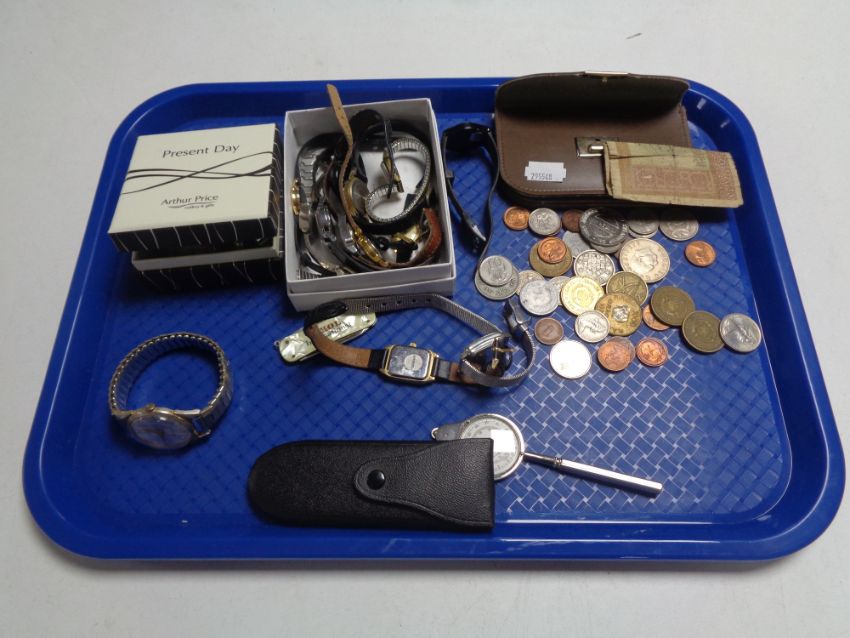A tray of assorted lady's wrist watches, foreign coins, Egyptian bank note, map measuring gauge leather purse etc