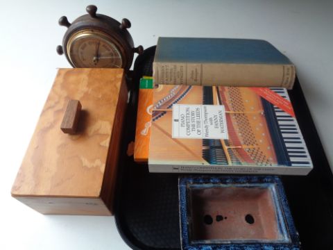 A tray containing music books, wooden trinket box, glazed pottery planter, together with a ship's wheel barometer