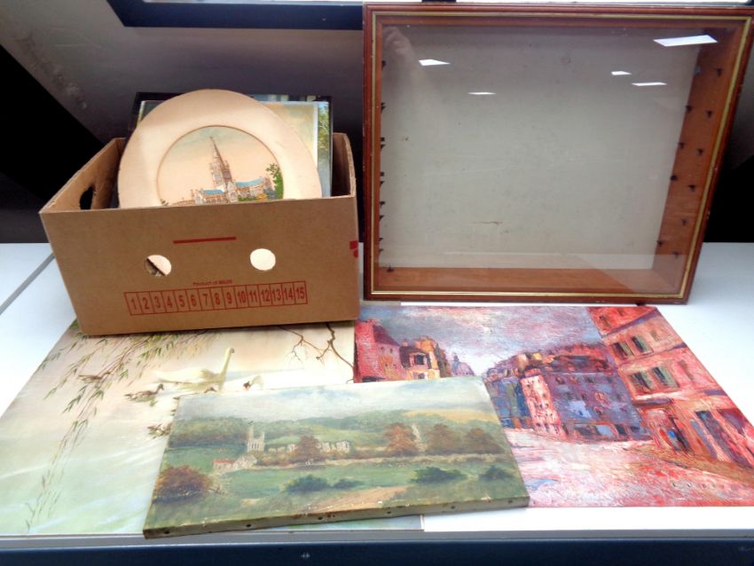 A quantity of unframed prints, oil on canvas, landscape scene, framed collage, Salisbury Cathedral, together with a wall cabinet