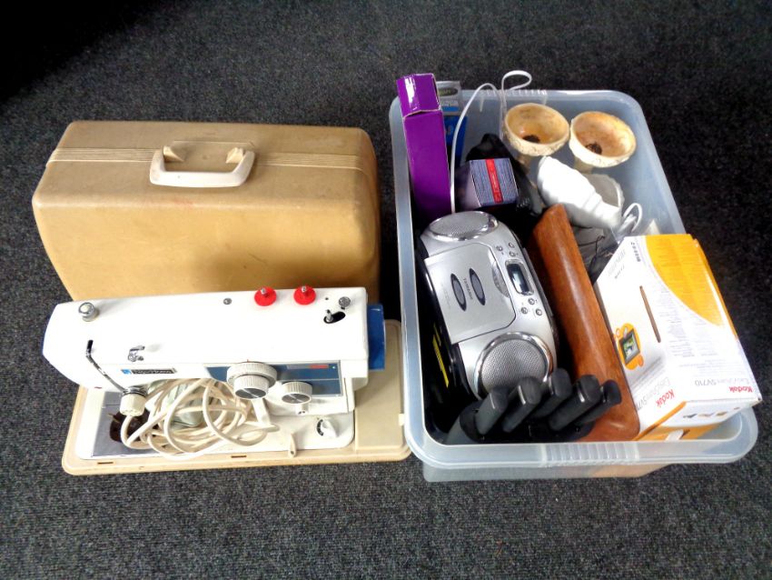 A cased New Home electric sewing machine together with a box containing CD radio, knife blocking knives, clock radio, digital photo frame etc