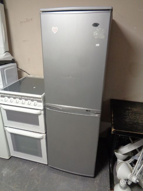 An upright fridge freezer (silver)