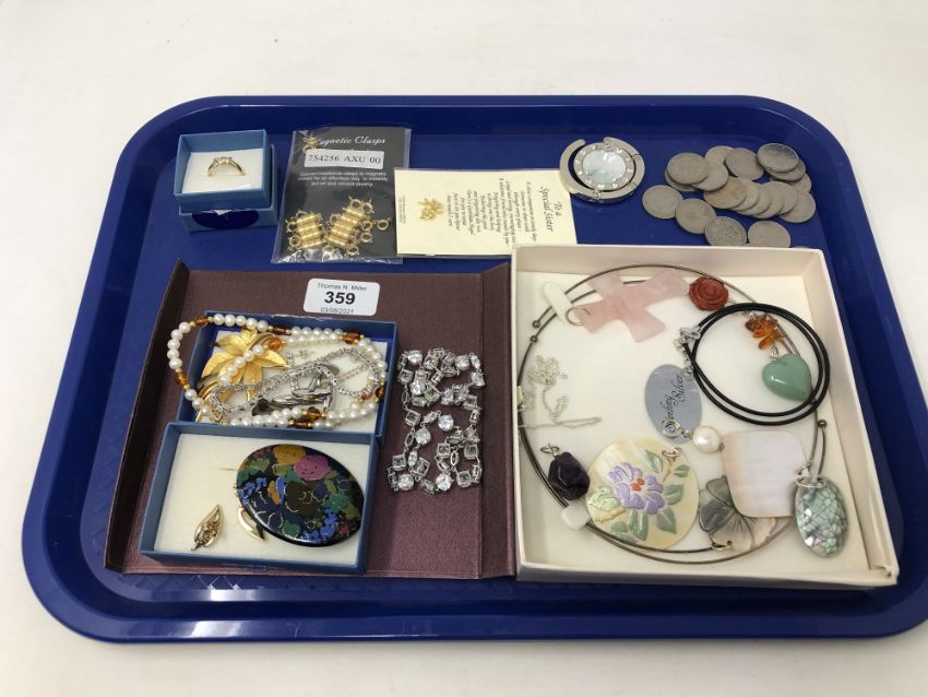 A tray of silver and costume jewellery, coins, pendants etc