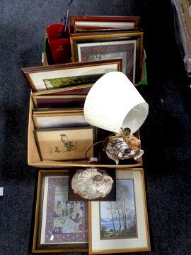 Two boxes containing pictures, figural table lamp with shade, champagne bucket etc