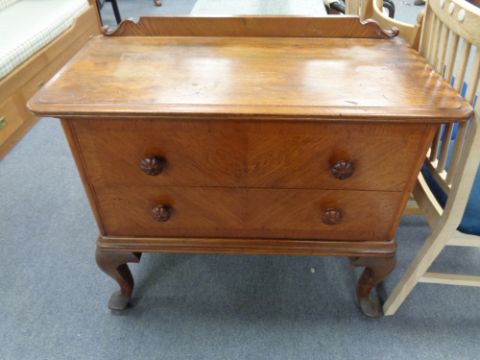 An early 20th century oak two drawer chest on cabriole legs