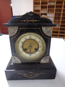 A late 19th century black slate and marble mantel clock with brass and enamelled dial