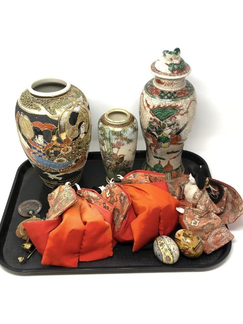 A tray of Japanese wares to include Satsuma earthenware vase depicting a pheasant (hairline crack), two later vases, geisha figures etc