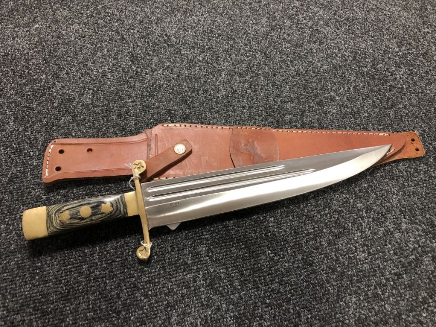A large hunting knife in leather sheath
