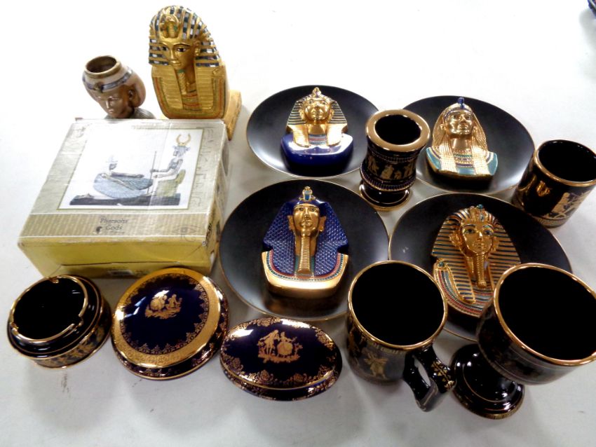 A box containing assorted Egyptian and Grecian wall plates, figurines, tankards and vases etc