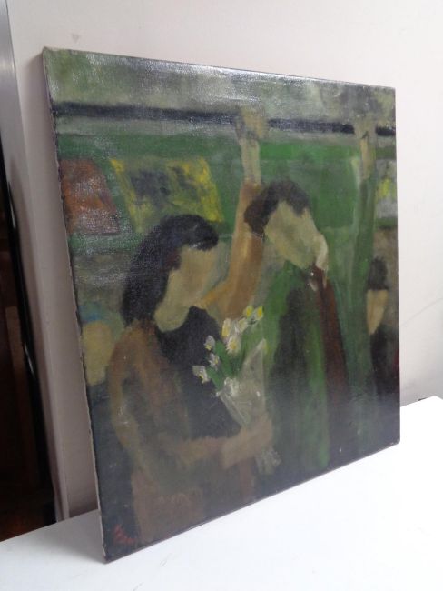 A 20th century oil on canvas, two figures on a train
