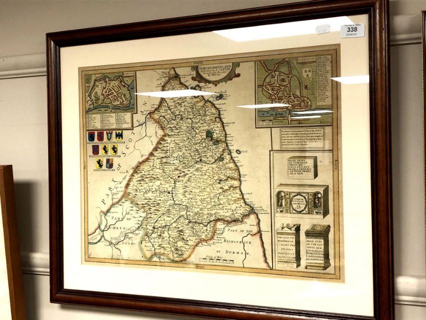 Christopher Saxton : Map of Northumberland, steel engraving, with hand colouring, on laid paper, 38 cm x 49 cm, framed.