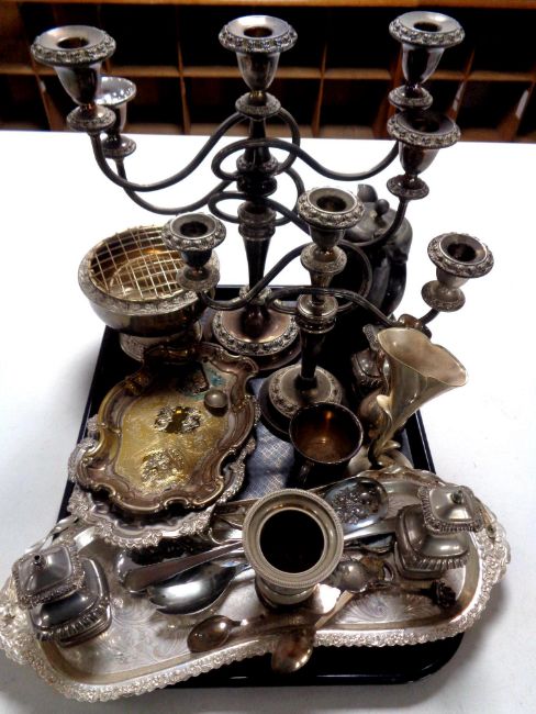 A tray containing 20th century plated wares to include rose bowl, table candelabra, trays, cruets, cutlery