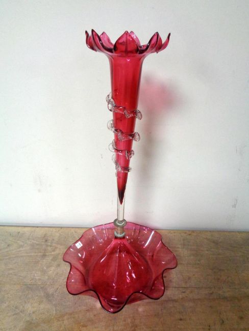 A Victorian cranberry glass single flute epergne