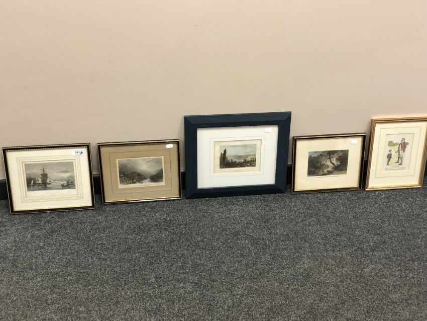 After John Wilson Carmichael : At Shields, Looking East, bookplate engraving by Lambert & Collard, with handcolouring, 12 cm x 17 cm, together with three further handcoloured topographical bookplate engravings as well as a handcoloured bookplate illustration "A Town Mouse", all five parts framed. (5)