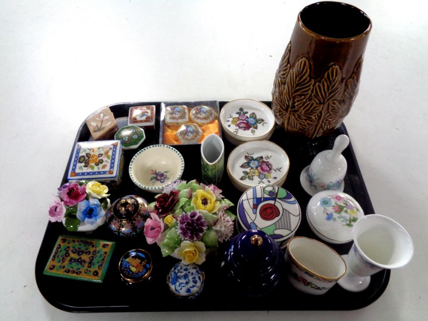 A tray containing miscellaneous to include lidded pill boxes, Royal Worcester coasters, Wedgwood and Aynsley cabinet china, china flower posies etc