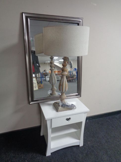 A contemporary bedside table fitted a drawer together with a silver framed mirror and a wooden table lamp with shade