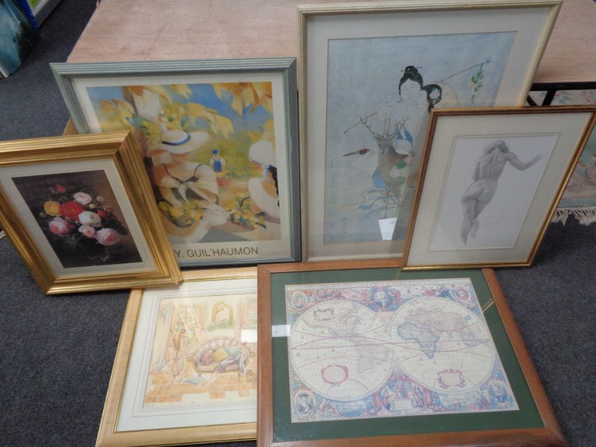 Six large framed prints to include world map, a M Glyne signed Art Deco print, still life etc