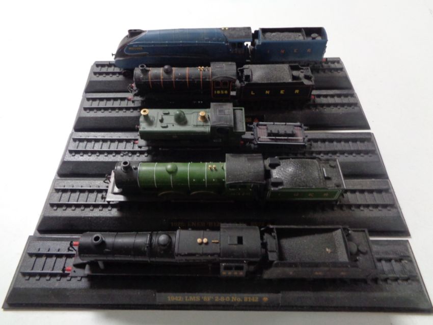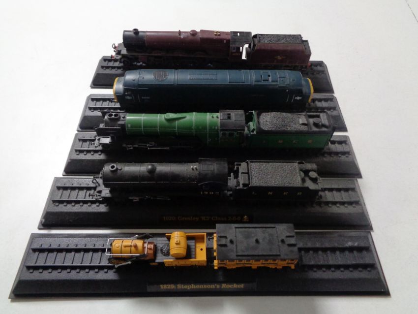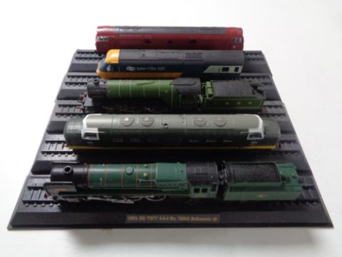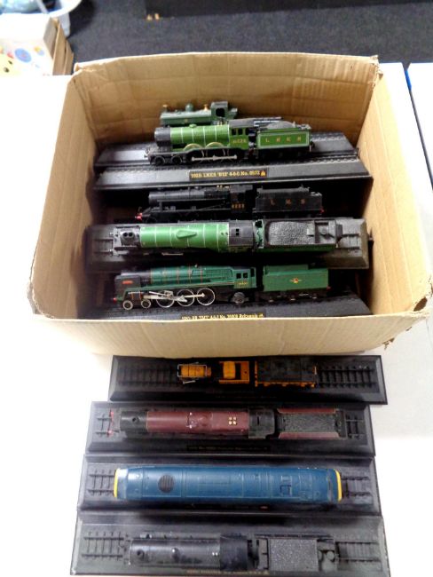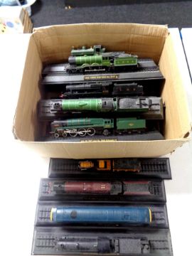 A box containing 15 die cast model trains on stands to include Flying Scotsman, A4 Mallard, Stephenson's Rocket, Intercity 125 etc