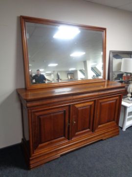 A nine piece Barker and Stonehouse dining room suite comprising of triple door sideboard fitted three drawers, bevel edged over mantel mirror, oval pedestal extending dining table with leaf and a set of six chairs