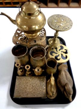 A tray containing assorted brass wares to include trivet teapots, tankards, ornaments, cigarette box etc