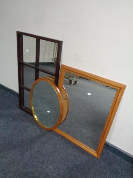 A pine framed mirror together with a sectional mirror and an oval teak framed mirror