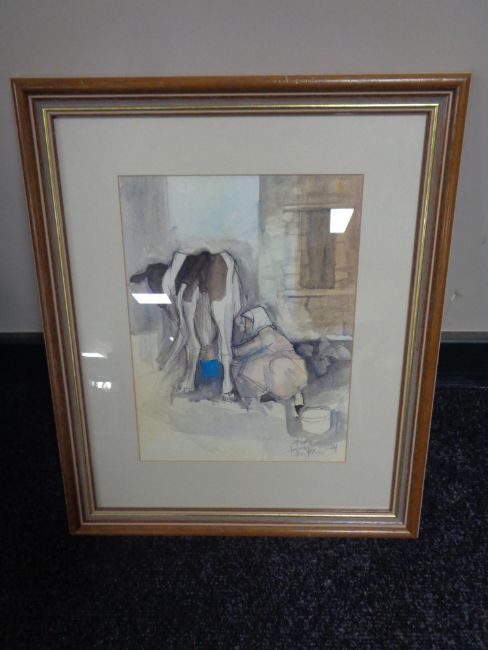 A watercolour of a milkmaid and cow, indistinctly signed, 50cm by 40cm.