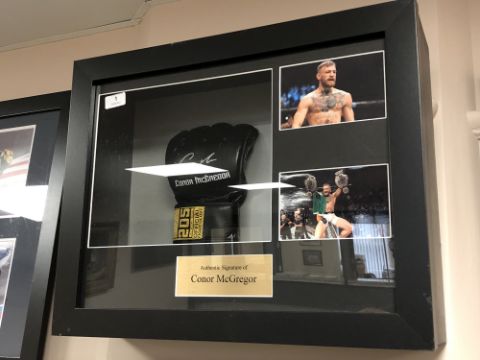 A sporting memorabilia montage : A signed UFC boxing mitt Conor McGregor, with certificate of authenticity from Montage Moments, 54 x 43 cm
