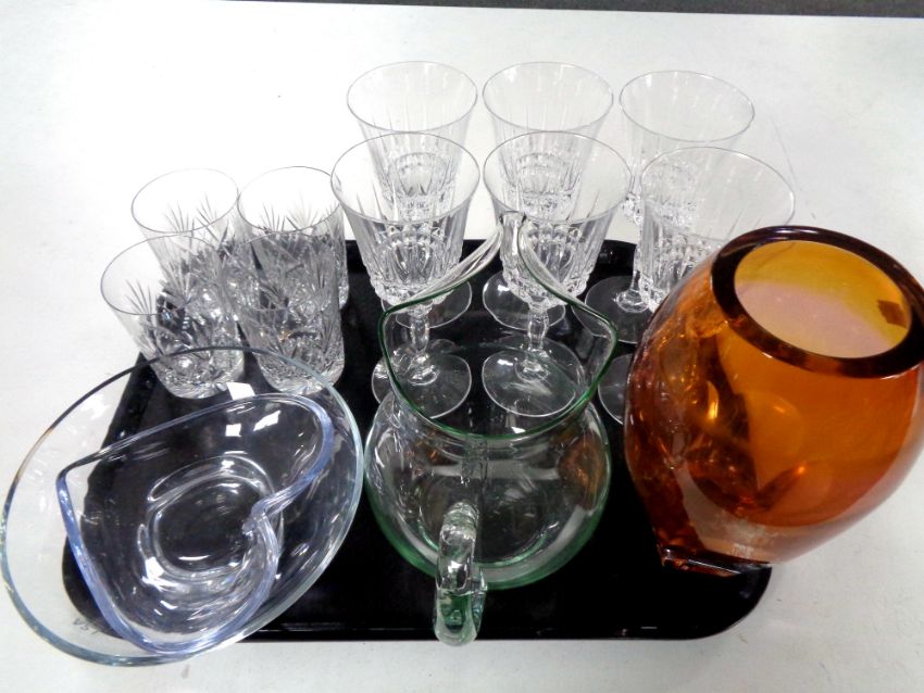 A tray containing assorted glassware to include set of four lead crystal tumblers, set of six wine glasses, amber tinted vase etc