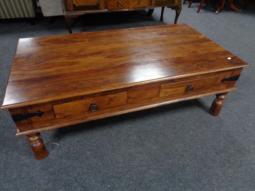 A contemporary sheesham wood four drawer coffee table on raised legs