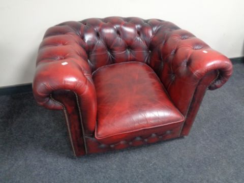 A red button leather Chesterfield club armchair
