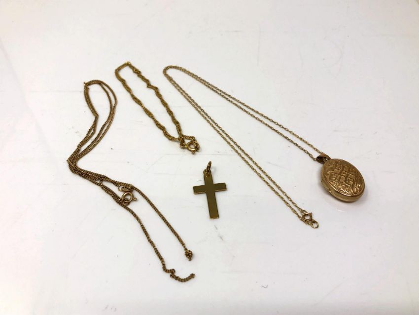 9ct gold jewellery comprising a locket on chain, a crucifix, a rope-twist bracelet and a chain (broken)