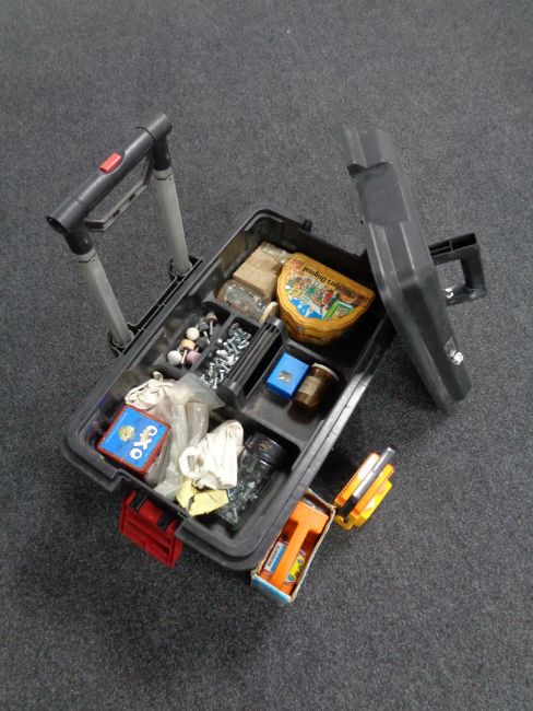 A plastic tool chest on wheels containing assorted tools together with a motoring lamp and a camp lamp
