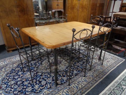 A South African Knysna Furniture hardwood dining table on wrought iron legs together with a set of six wrought iron dining chairs