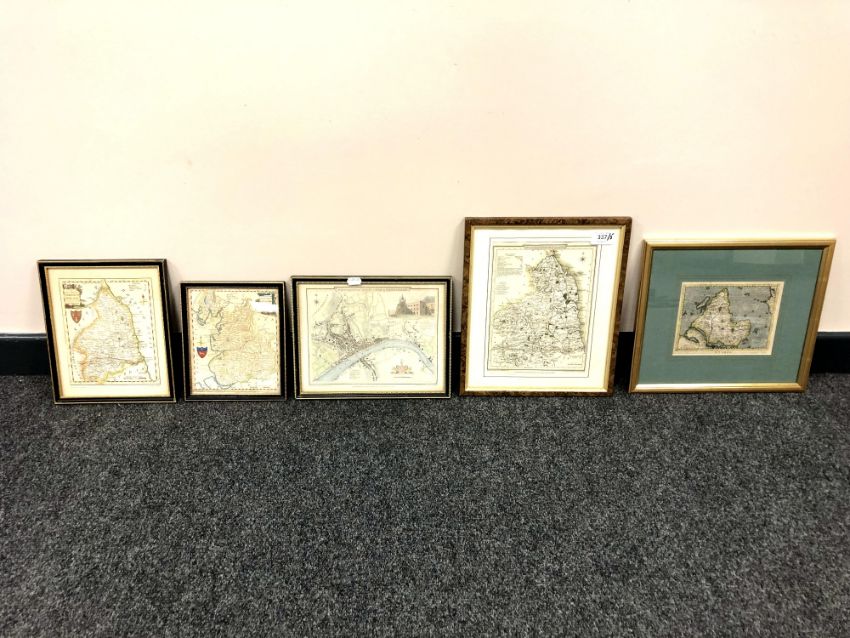 J Roper (Engraver) : Map of Northumberland, steel engraving, with hand colouring, published by Vernor, Hood & Sharpe, 1808, together with four further hand coloured maps depicting Newcastle-upon-Tyne, Lancashire, Northumberland and Africa, all five parts framed. (5)