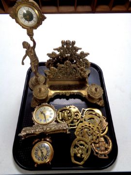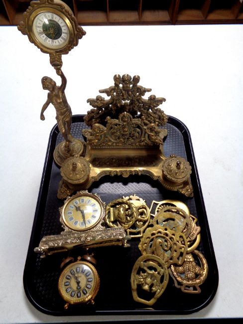 A tray containing assorted brass wares to include ornate desk stand with inkwells, figural clock, alarm clock, horse brasses etc