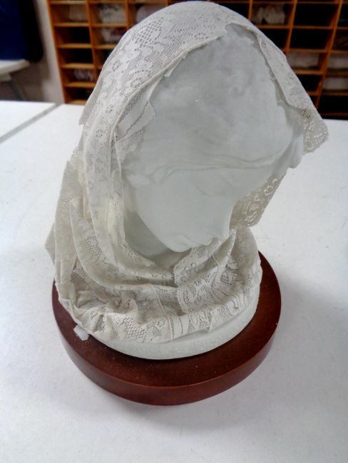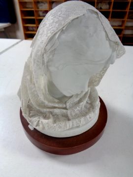 A Lladro bust, The Madonna, with sugar spun headdress (as found) on wooden base