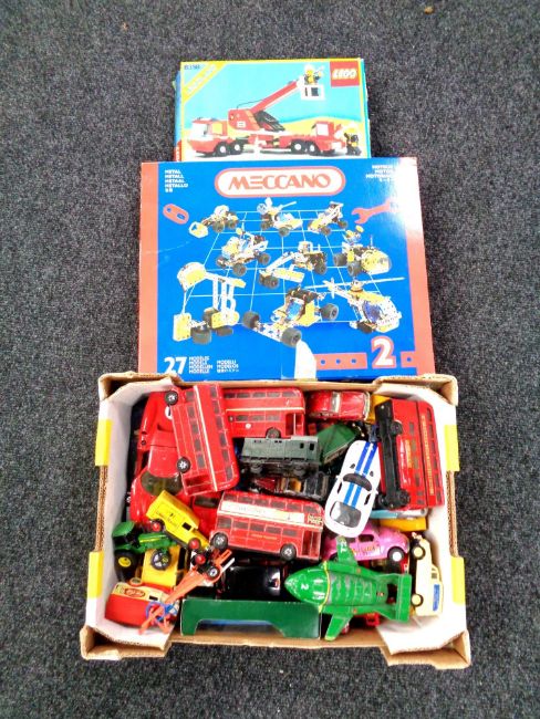 A box containing mid 20th century and later die cast vehicles to include a Matchbox Thunderbird II, Corgi buses, Dinky toys etc, together with a Meccano construction set and a Lego 6358 box containing Lego (unchecked)