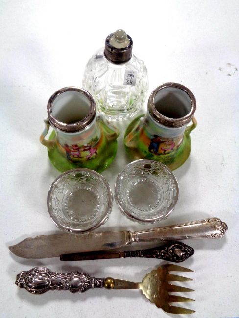 A cut glass silver rimmed perfume bottle together with a pair of cut glass silver rimmed salts, a pair of Royal Bayreuth Bavarian silver rimmed transfer printed vases together with a silver handled knife, fork and pair of tongs (8)